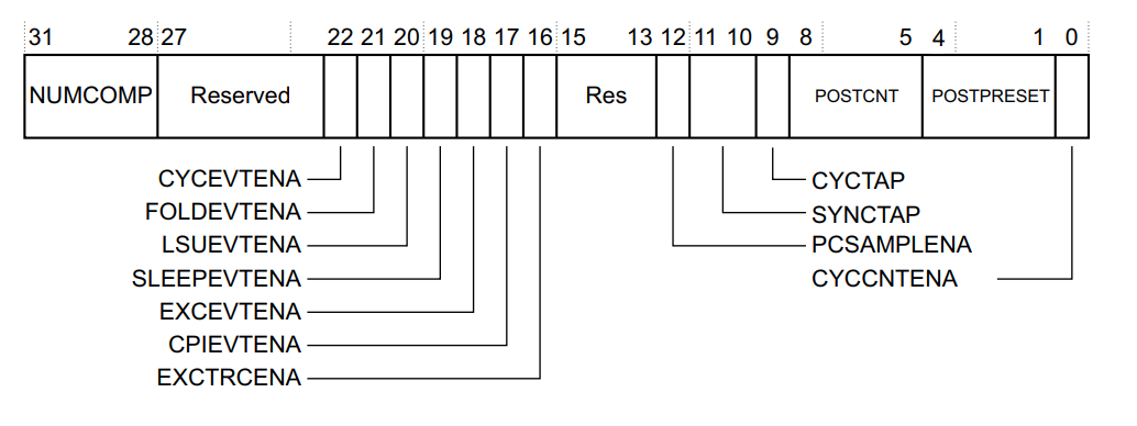 We already know how to enable the cycle counter: we set the CYCCNTENA bit in the DWT Control Register (this was required for PC sampling as well).